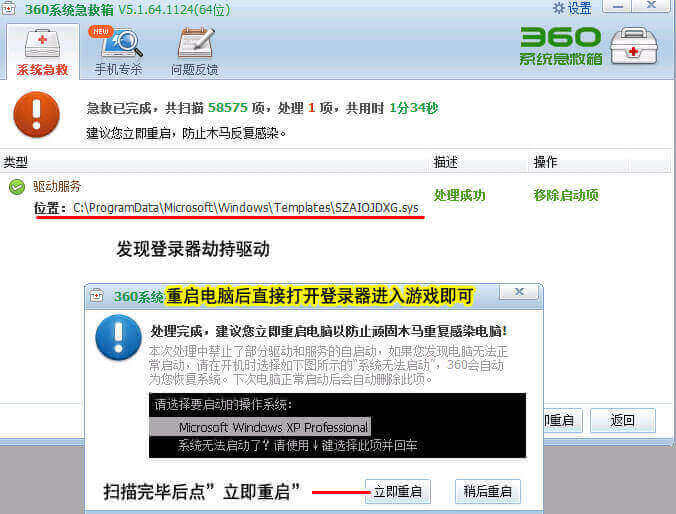 扫描完成后,根据工具提示重启系统,即可完成劫持清理!
